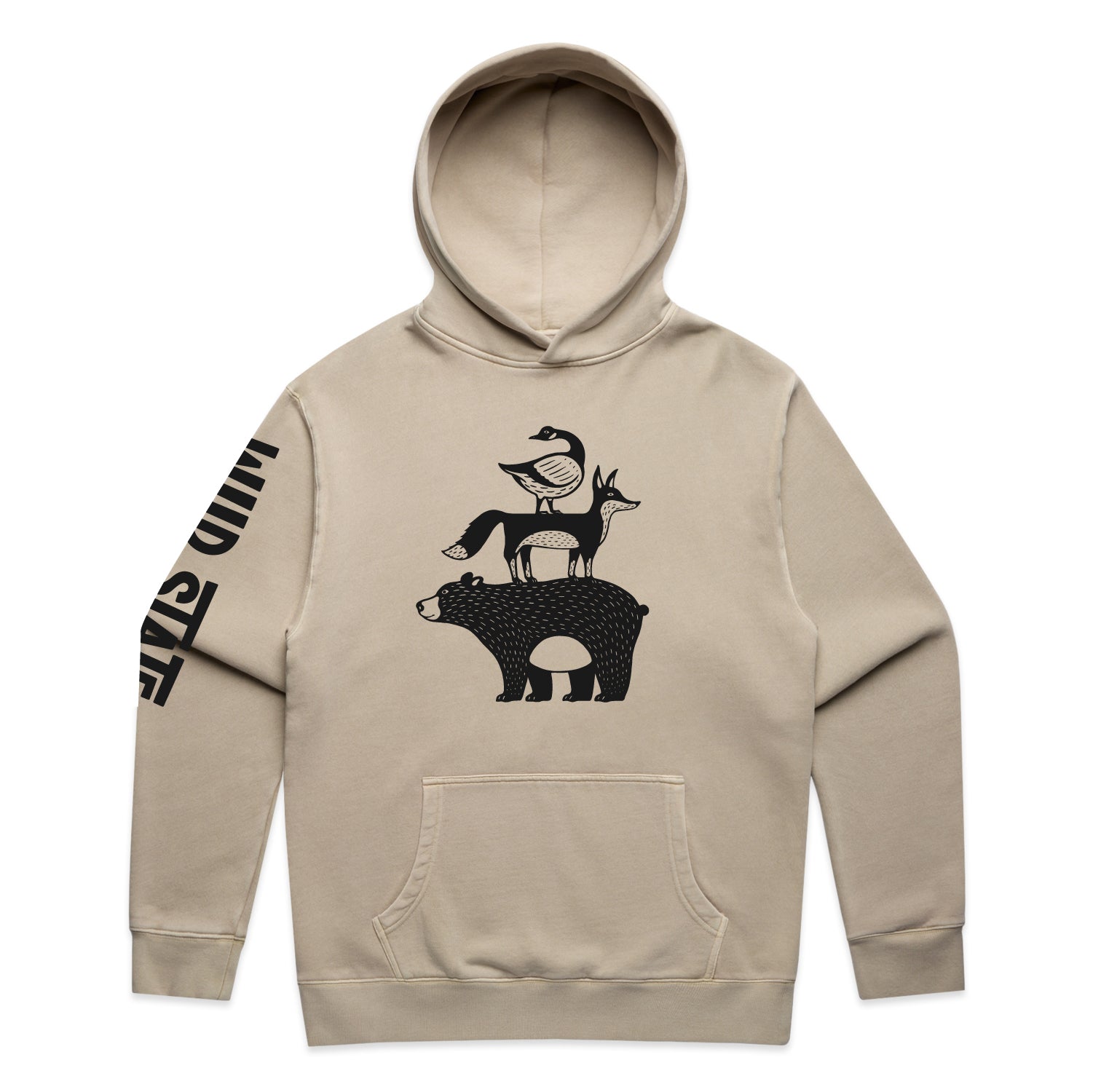 Pullover hood, drop shoulder, kangaroo pocket, self-fabric lined hood, no drawcord, garment dyed, sleeve cuff ribbing